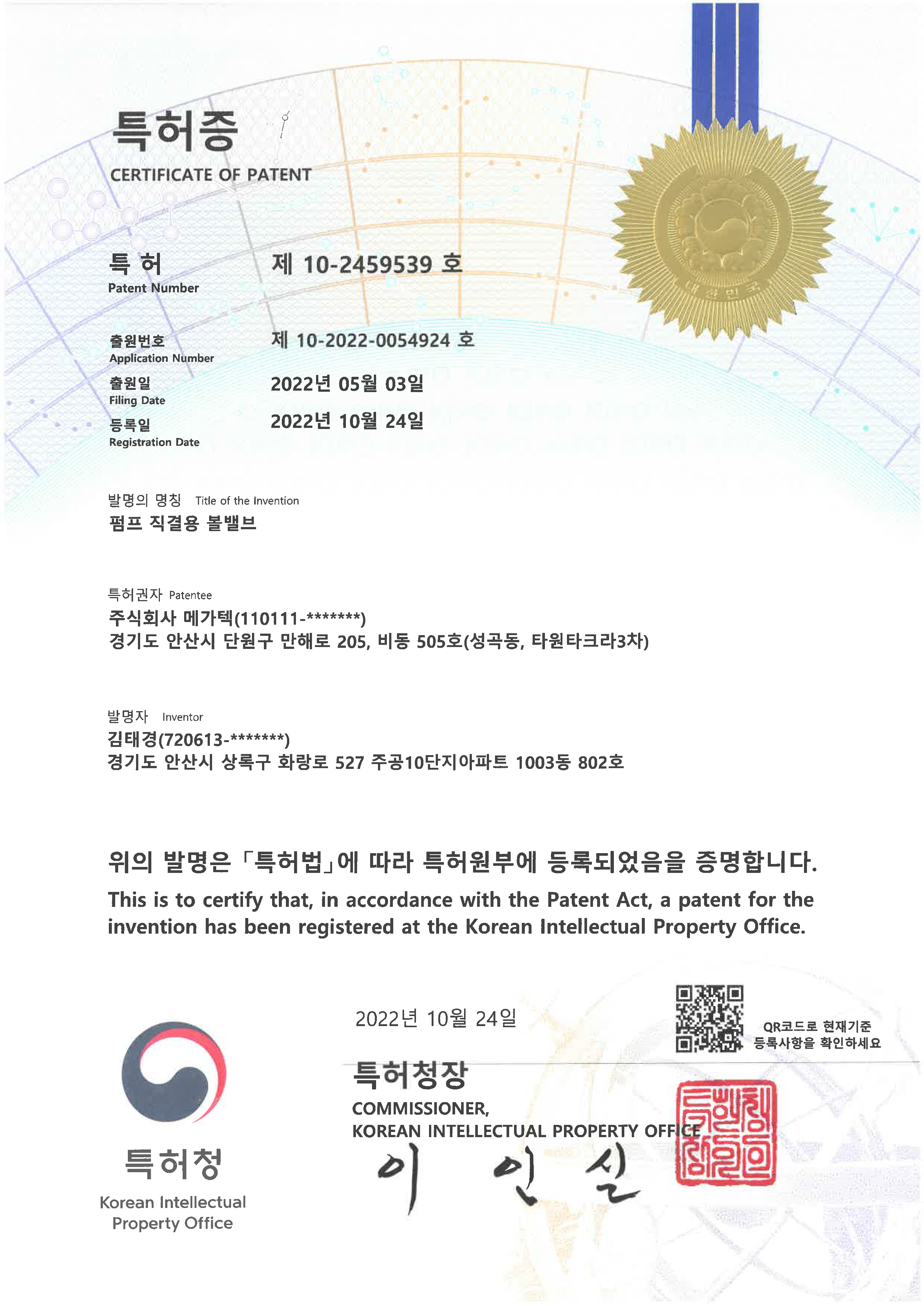 주식회사 메가텍이 오랜 연구 개발결과 [펌프 지결용 볼밸브]에 대하여 특허 등록이 완료되었습니다.